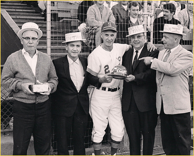 ![]() Seattle Pilots' coach Frank Crosetti was given a miner's helmet by four Montanans who visited Seattle's Sicks' Stadium They are, from left, Emmett Corrigan and Eugene Brunell of Anaconda and Phil Paull and Padraig Sullivan of Butte. Crosetti played minor league baseball in Butte before moving to the majors. This photo originally appeared in The Montana Standard newspaper.